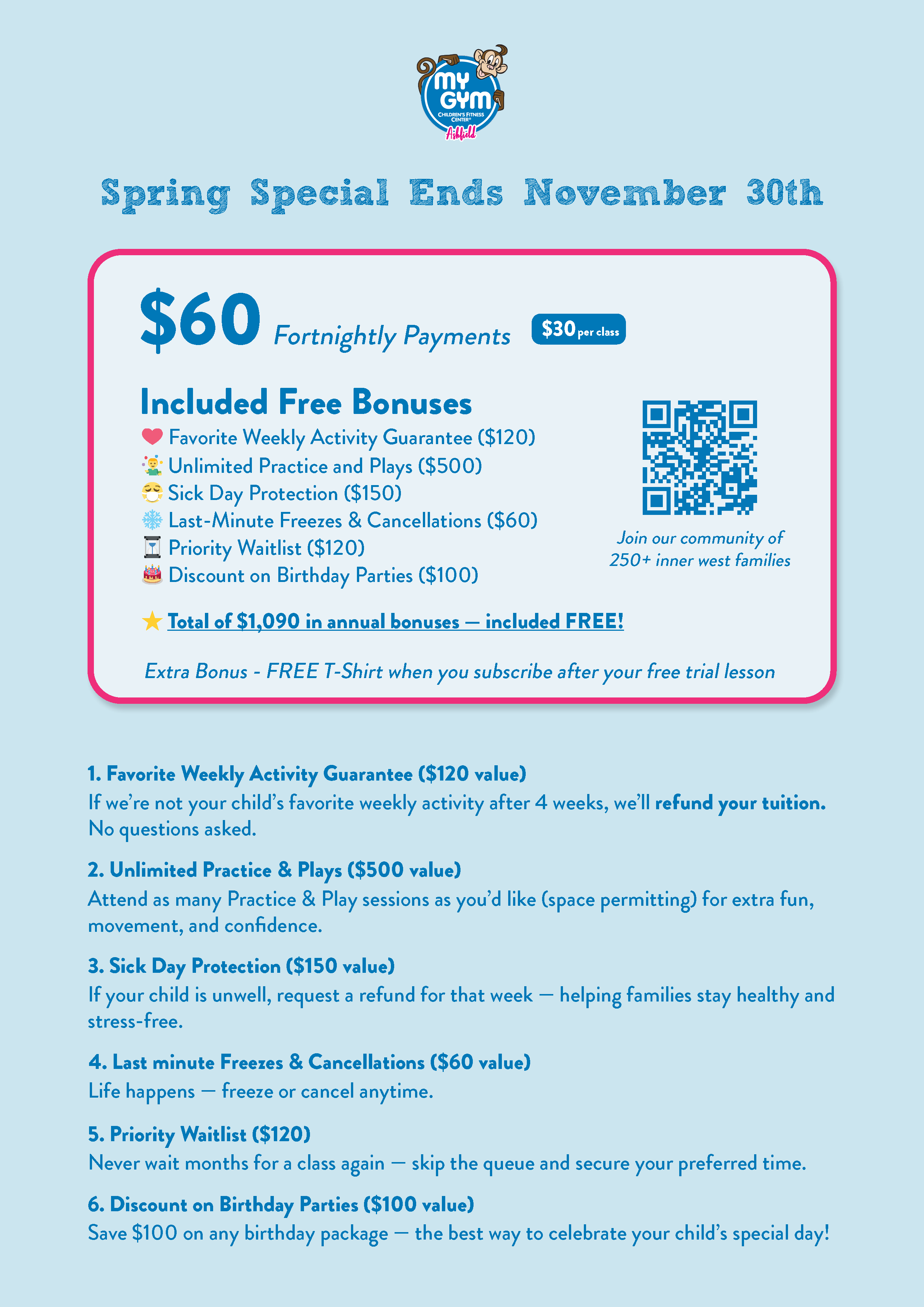 From the date of your absence you have 4 weeks to book a make-up class. If your child is sick we can reduce your payment accordingly. You can also freeze your account 2 - 8 weeks.