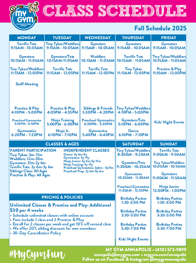 You are invited to attend a FREE CLASS on US! That's Right! From Tuesday, October 14th - 20th, we will be running a "Free Preview Week!" This means you can select a class and come have a ball at My Gym Annapolis. All classes are age-appropriate. From Parent and Me programs to Ninja Jr and Preschool Gymnastics classes, we guarantee you and your child will have a blast!