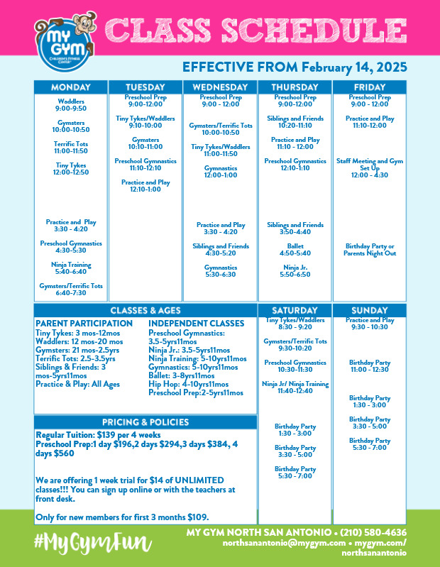 From Parent & Me programs to Ninja Training and Gymnastics, we’ve got FUN and exciting classes for kids 3 months to 10 years.