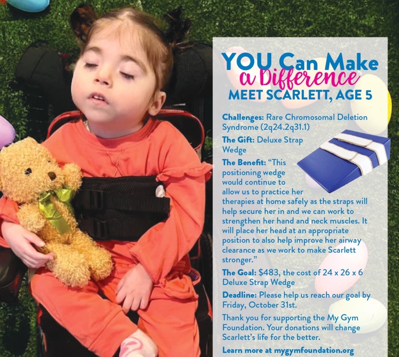 This October, My Gym San Carlos is joining forces with the My Gym Foundation—a nonprofit that helps children facing physical and cognitive challenges. We’re fundraising for Scarlett to provide a therapeutic positioning wedge to help her meet her physical therapy goals from the comfort of her own home. Let’s celebrate Halloween and make a difference for Scarlett together!
